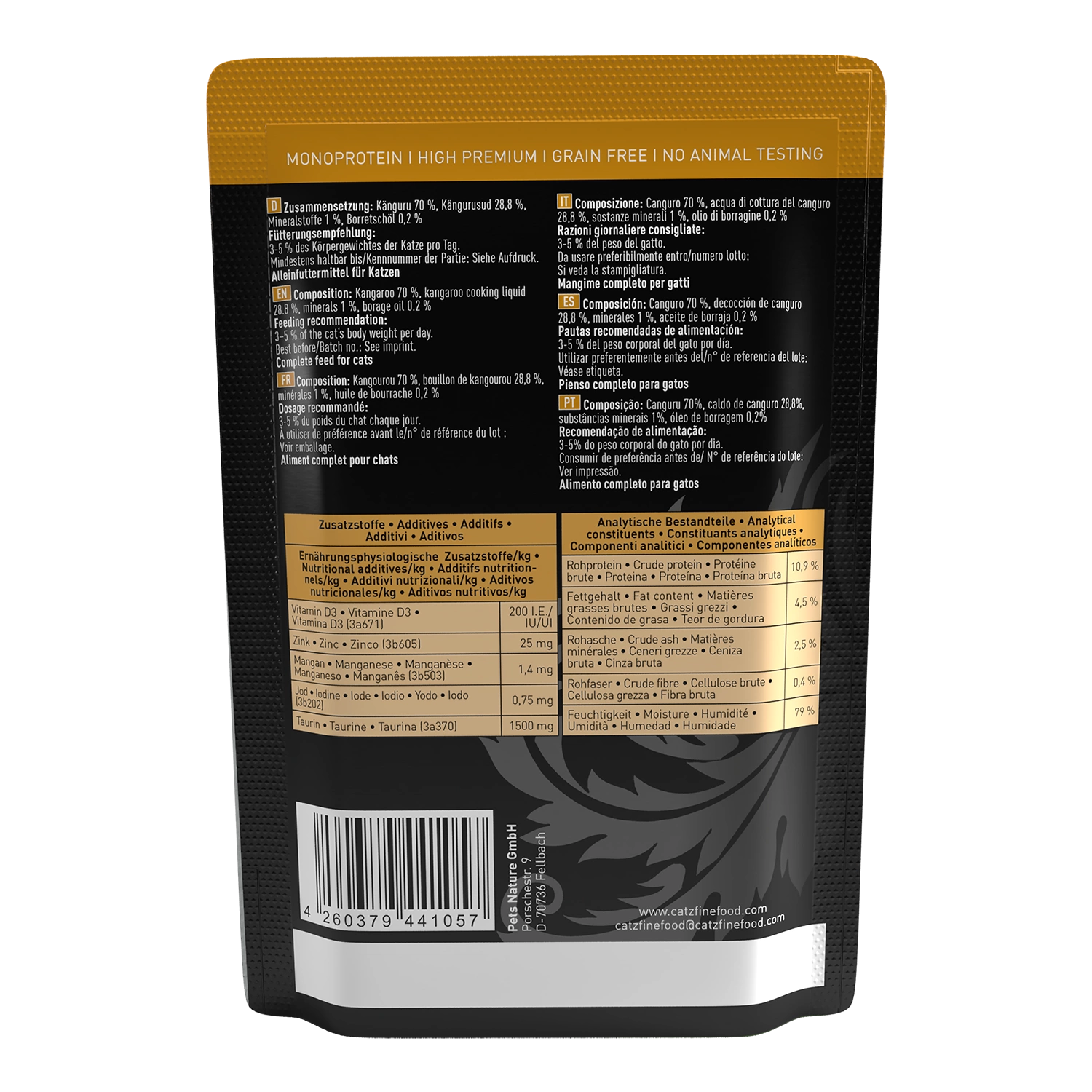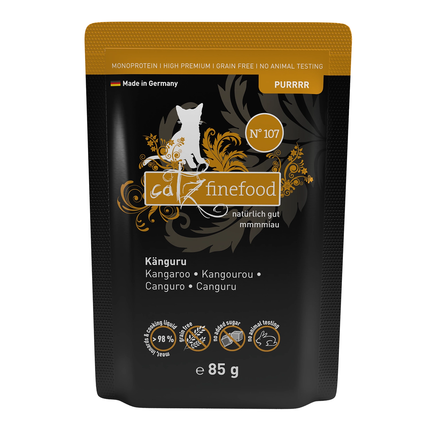 Catz finefood Purrrr No. 107 stworzona jest z soczystego kangura, rosołu oraz oleju z ogórecznika. Ze względu na ograniczoną ilość składników idealnie nadaje się dla kotów, które cierpią na nietolerancję pokarmową.