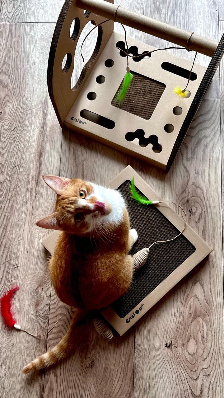 Kartonowy drapak stworzony z myślą o zaspokojeniu naturalnych instynktów Twojego futrzanego przyjaciela. Zapewni kotu idealne miejsce do ostrzenia pazurków oraz dostarczy rozrywki i relaksu. Poruszające się piórka przyciągną uwagę kota, zachęcając go do zabawy. To świetny sposób na pobudzanie zmysłów kota i utrzymanie go w doskonałej kondycji.